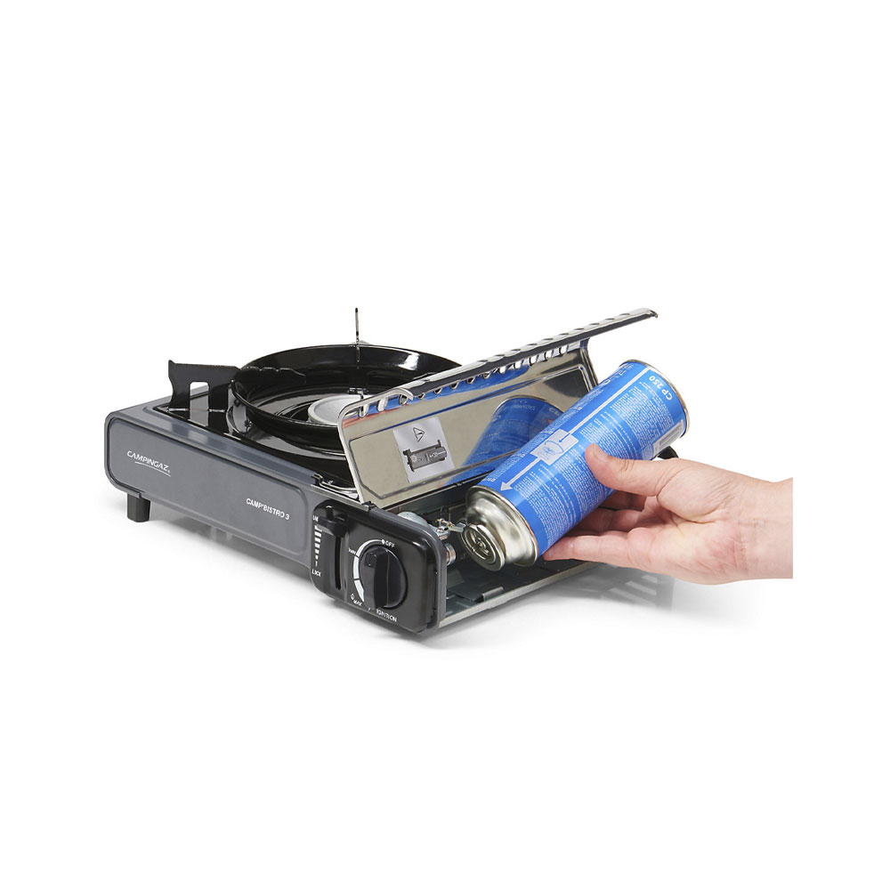 Produktinformation: , Der Topfträger und das obere Hitzeblech sind aus Edelstahl, für eine einfache Reinigung und eine bessere Hitzeabstrahlung, Mit Kartuschensicherung «Safety-Lock» - Hebel neben dem Gasregler unterbricht die Gaszuführung schnell und einfach oder stellt sie ebenso rasch wieder her, Mit Kunststoffkoffer für den einfachen und sicheren Transport, Piezozündung und der stufenlos verstellbare Regler machen die Bedienung und die Regelung sehr komfortabel, Oberfläche aus emailliertem Stahl, Breite Standfläche, Auch für grosse Pfannen und Töpfe brauchbar, Topfträger ist auf der Seite etwas höher gezogen und sorgen für einen sicheren Stand der Töpfe, Brennleistung: 2200 W, Gasverbrauch 160 g/h (CP 250), Brenndauer: 1h20min