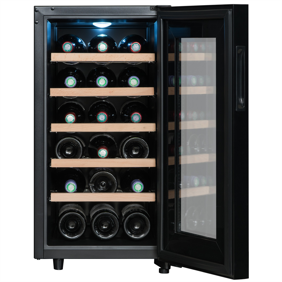 Die weisse LED-Beleuchtung und der in die Türkante integrierte Griff unterstreichen die Ästhetik des CC18F-Kellers noch weiter. Die Beleuchtung ist mit einem Schalter ausgestattet, so dass Sie sie auch ausschalten können.