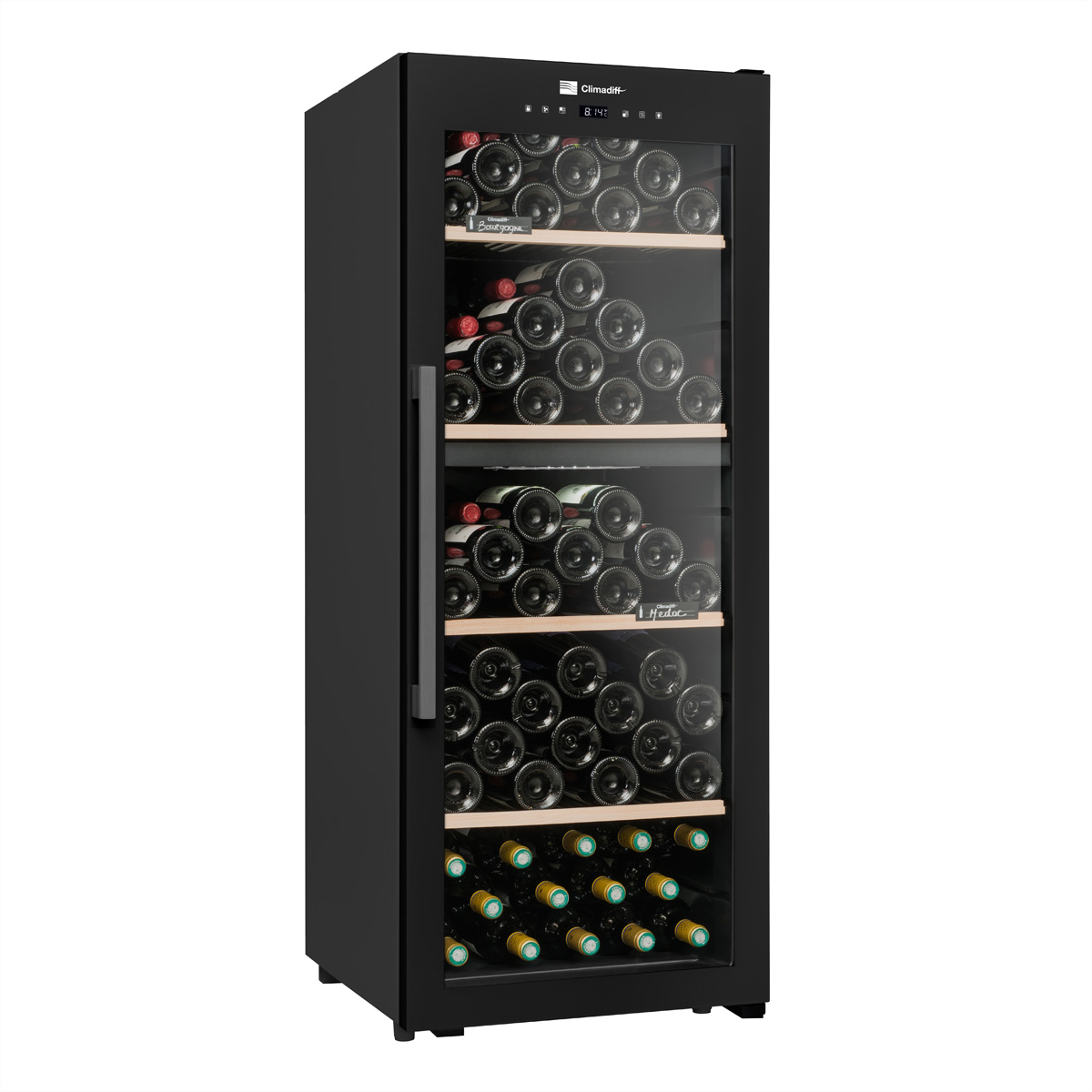 Der Weinkeller CLD115B1 ist eine Neuheit des Jahres 2023 mit einem neuen, eleganten schwarzen Design: Als Zwei-Zonen-Weinkeller bietet er den unbestreitbaren Vorteil, zwei Weinsorten mit unterschiedlichen Temperaturen in einem einzigen Gerät aufbewahren zu können.