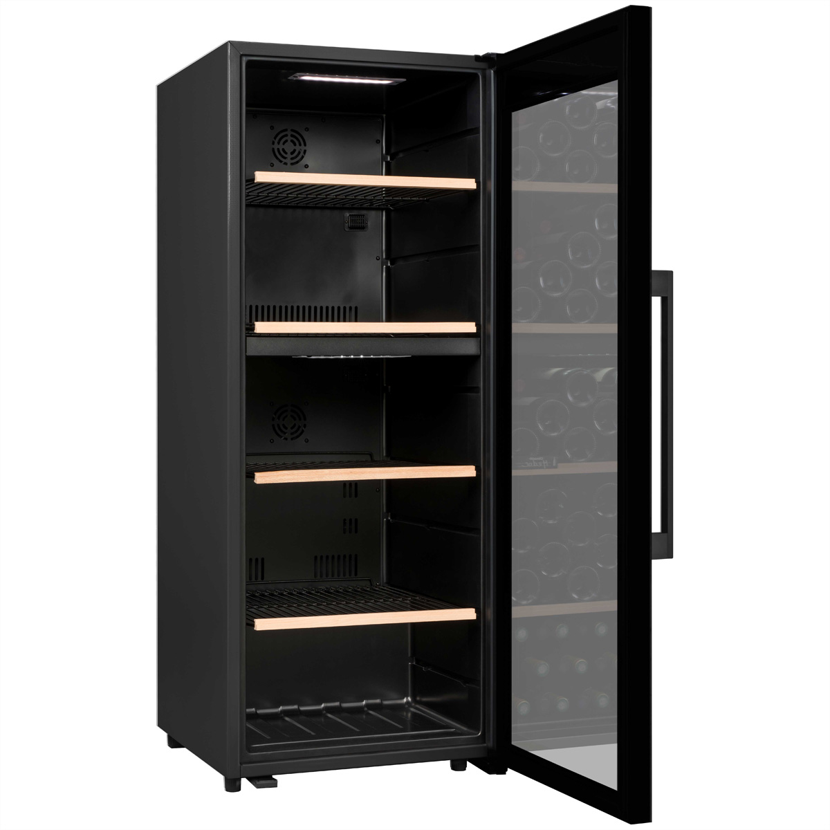 Das Schwarz des Humidors und das natürliche Holz der Regale sind stilvoll kombiniert und verleihen dem Gerät das gewisse Etwas. Die vertrauliche weisse LED-Beleuchtung lädt zum Betrachten und Verkosten ein. Ein Schalter ermöglicht es Ihnen natürlich, die Beleuchtung auszuschalten, wenn Sie dies wünschen.