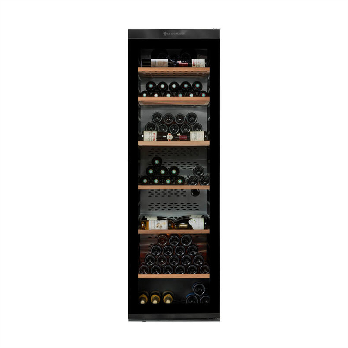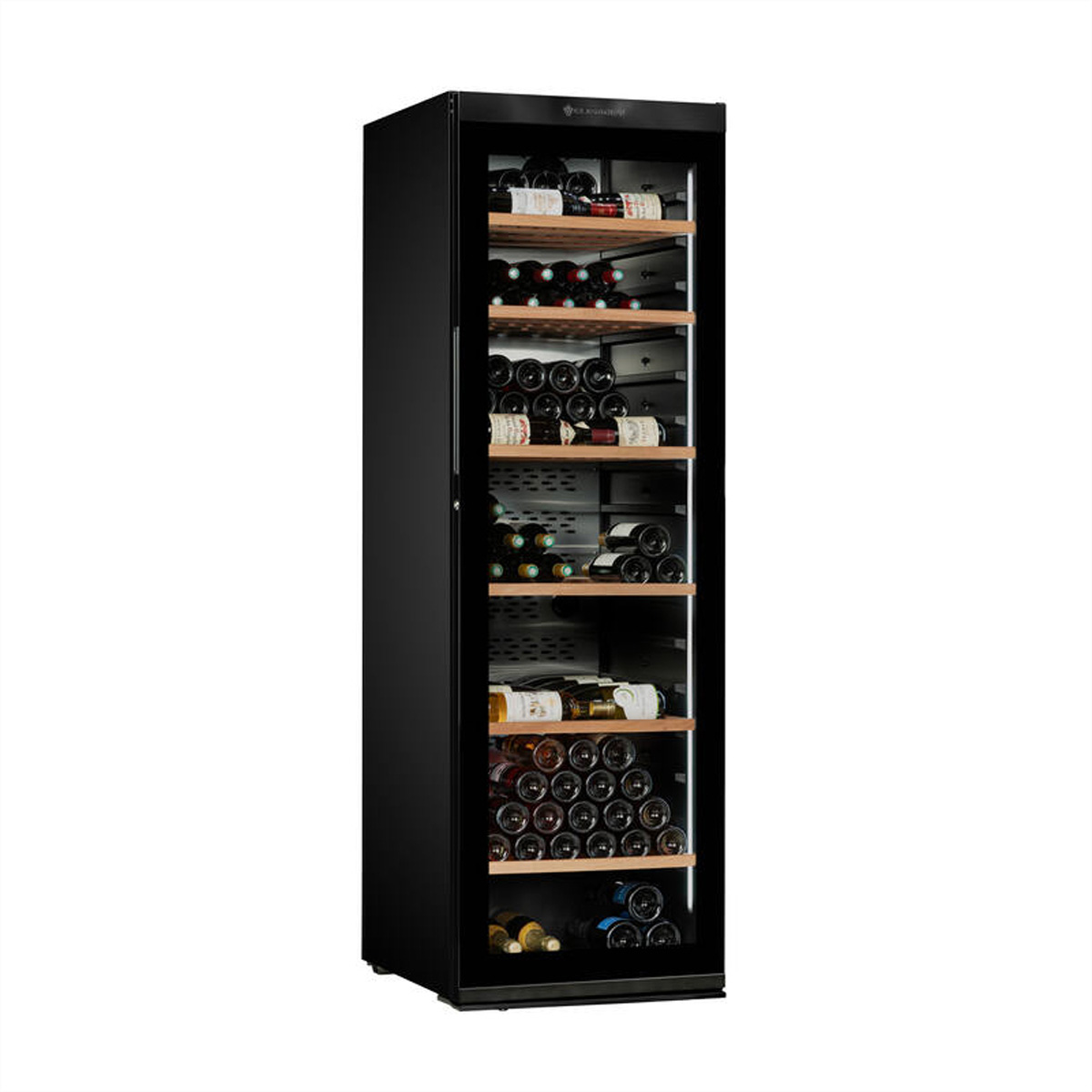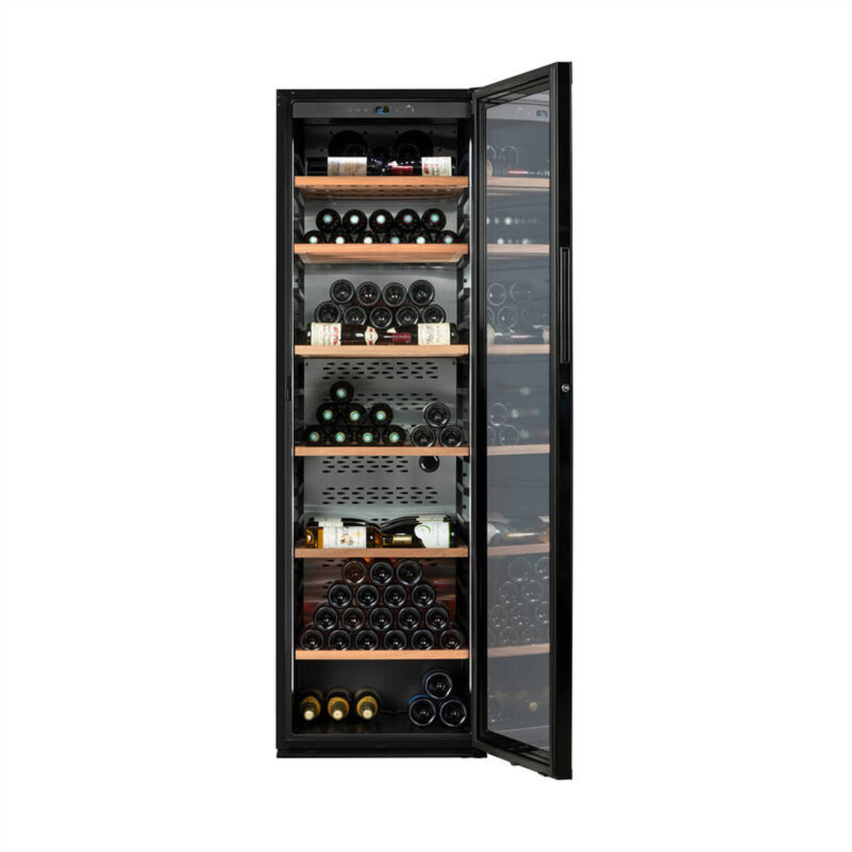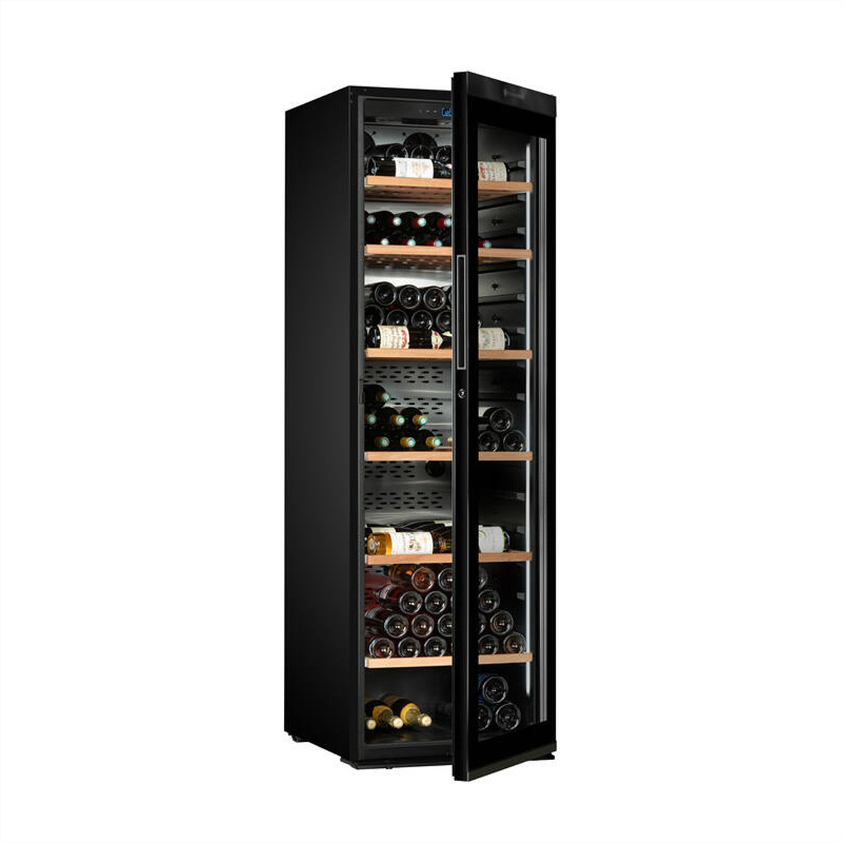 Die Premium-Ausstattung umfasst 6 gleitende Regale aus Sapelli-Holz, die langlebig und vibrationsabsorbierend sind. Eine integrierte LED-Seitenbeleuchtung setzt die Flaschen stilvoll in Szene, während ein Aktivkohlefilter die Luftqualität im Inneren verbessert.