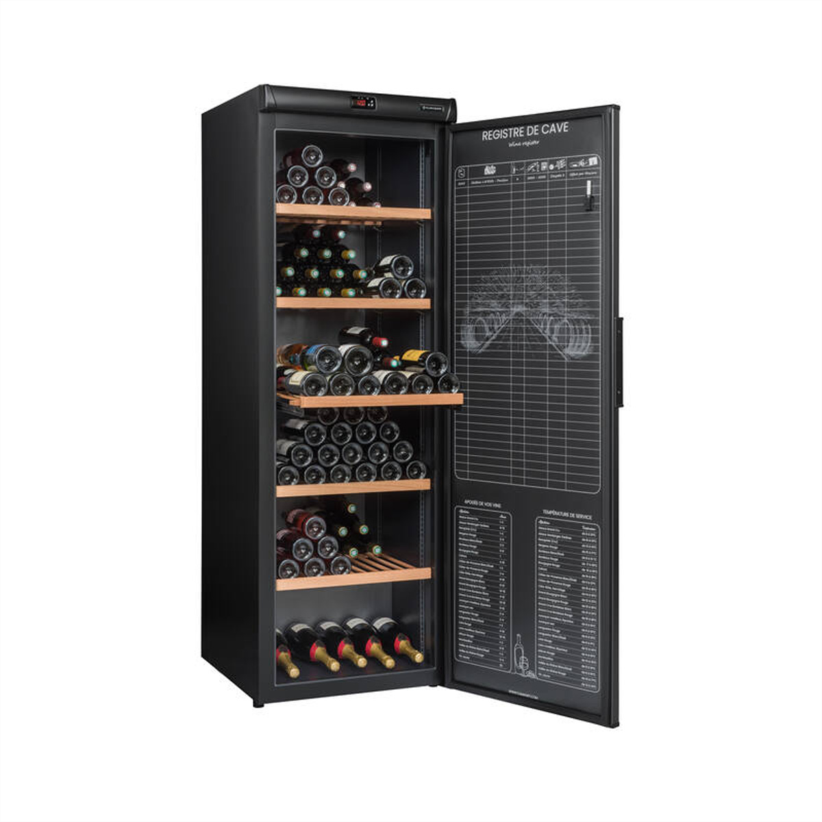 Zusätzliche Sicherheitsfunktionen wie Anti-Vibrationssystem, regulierte Luftfeuchtigkeit und eine bedruckte Innentür zur besseren Organisation machen ihn zur idealen Wahl für Weinliebhaber.