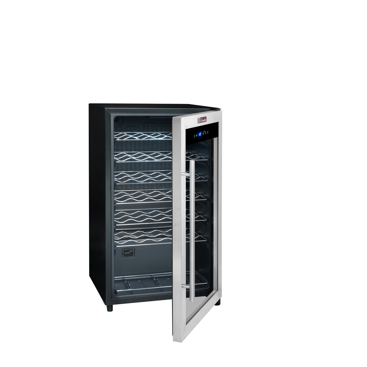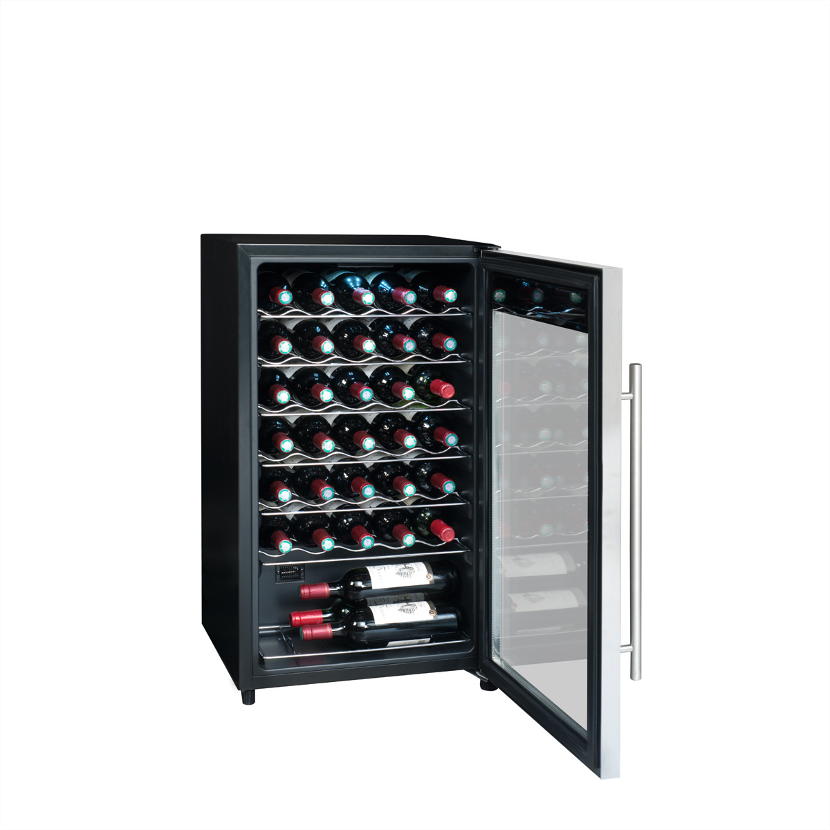Der Weinservierschrank LS34A bietet eine Lagerkapazität von maximal 34 Flaschen*. Im Einzonenschrank können Sie die Temperatur zwischen 5° und 20°C einstellen. Die Temperatur wird über die Touch-Bedienung vorne an der Tür eingestellt, ohne die Tür zu öffnen. Der formschöne Schrank wird mit 6 Ablagerosten aus Metalldraht sowie einem halben Rost für den unteren Teil des Schranks geliefert. Der Weinschrank ist ein umweltverträgliches Produkt und hat die Energieeffizienzklasse A, ein Zeichen für geringen Stromverbrauch.