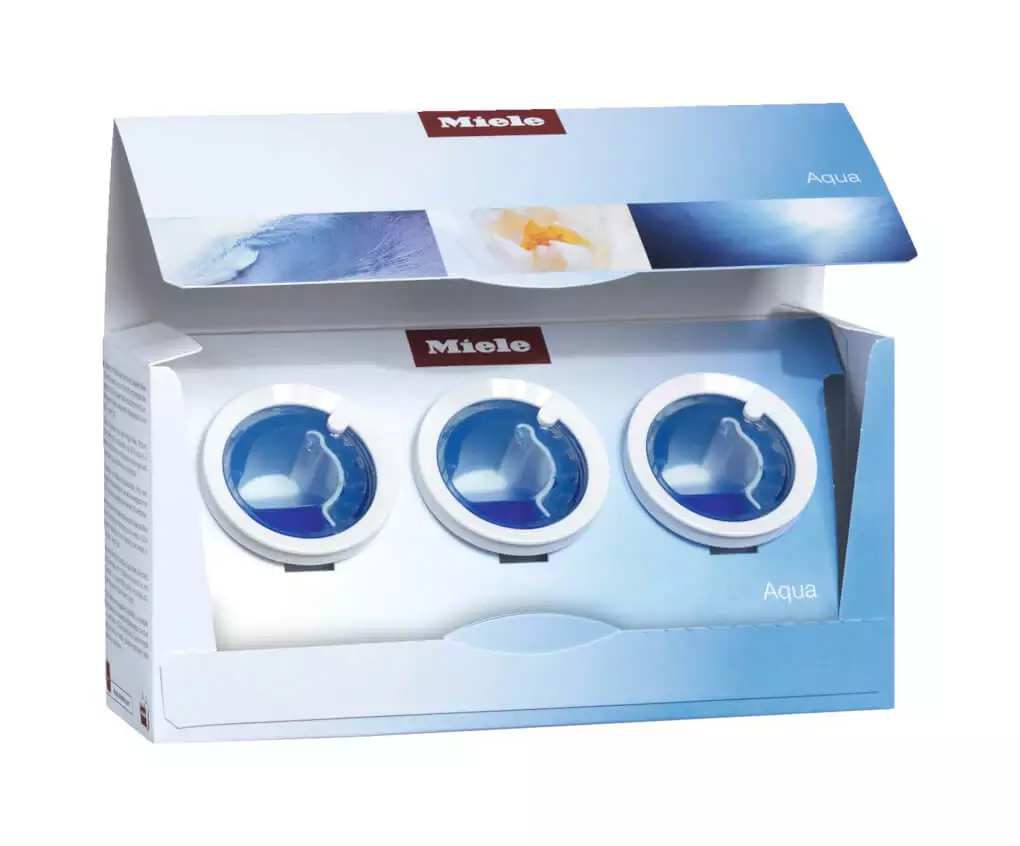 Set 3-mal Miele Aqua für 150 Trocknergänge – belebend wie eine frische Meeresbrise.