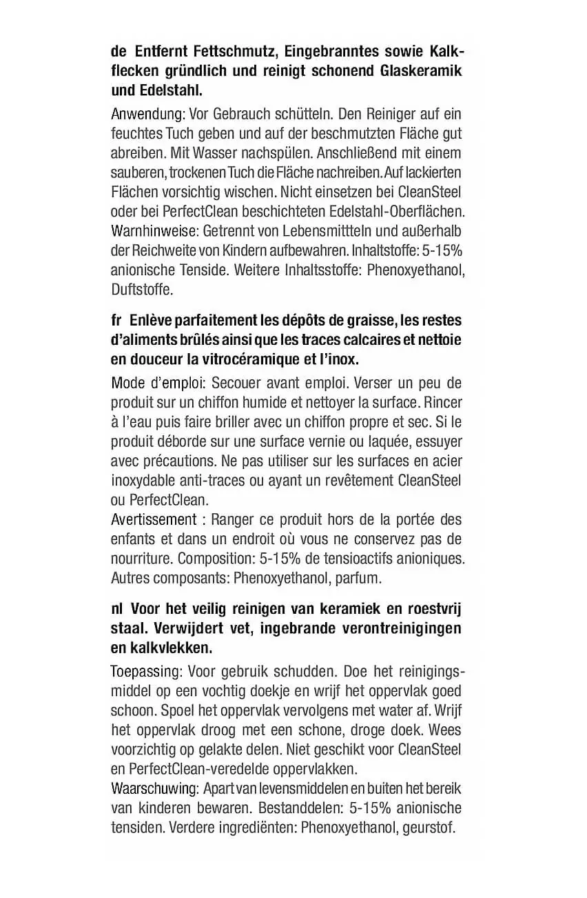 Glaskeramik-/Edelstahlreiniger, 250 ml für beste Reinigungsergebnisse und eine sichere Anwendung. Bestes Produkt am Markt — Testsieg in der Schweiz Entfernt kraftvoll Fettschmutz, Eingebranntes und Wasserflecken Hinterlässt einen Schutzfilm, der die Folgereinigung erleichtert Schonende Reinigung dank feinkristalliner Formulierung Nicht einsetzen bei CleanSteel oder PerfectClean