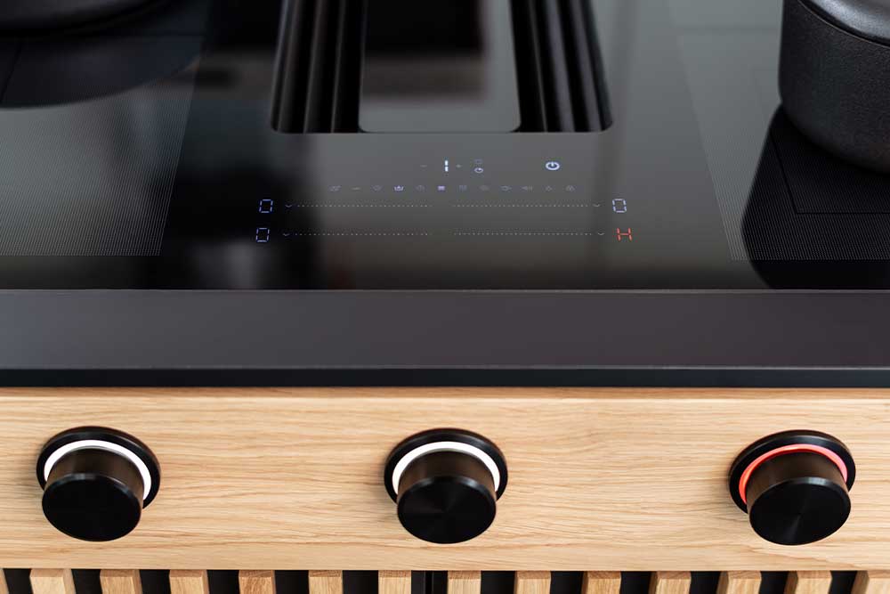 Elegante Drehschalter zur intuitiven Steuerung von Kochzonen und Lüftung