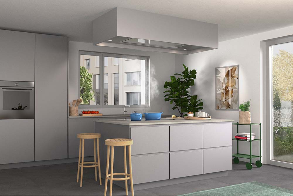 Leistungsstarke Deckenhaube ohne Licht für Kochinseln oder Integration in einen Oberschrank.