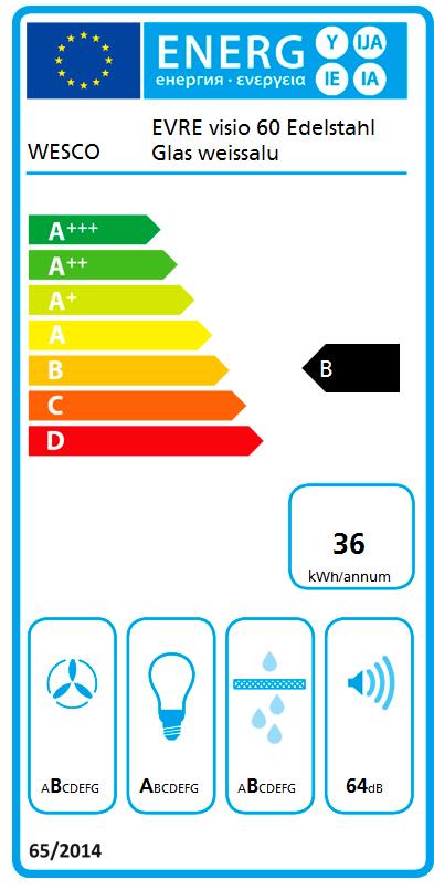 Technische Daten Typenschild Leistungsaufnahme Lüfter Motor 170 W Gesamtanschlusswert Max. 179.4 W Volt- und Herz-Angabe 230 V~ 50 Hz Luftleistung Anzahl Lüfter 1 Nennleistung Lüfter freiblasend 975m³/h Nennleistung Lüfter freiblasend total 975m³/h Leistungsstufen 3+i Luftleistung min. Abluft 240m³/h Luftleistung max. Abluft 420m³/h Luftleistung intensiv Abluft 520m³/h Luftleistung min. Umluft 180m³/h Luftleistung max. Umluft 330m³/h Luftleistung intensiv Umluft 370m³/h Schallleistung Schallleistungspegel 64dB(A) re1pW Schallleistungspegel min. Abluft * 52dB(A) re1pW Schallleistungspegel max. Abluft * 64dB(A) re1pW Schallleistungspegel intensiv Abluft * 69dB(A) re1pW Schallleistungspegel min. Umluft * 58dB(A) re1pW Schallleistungspegel max. Umluft * 69dB(A) re1pW Schallleistungspegel intensiv Umluft * 73dB(A) re1pW Druckvermögen Druckvermögen min. Abluft 150Pa Druckvermögen max. Abluft 350Pa Druckvermögen intensiv Abluft 355Pa Farbe/Material Farbe Gerät weiss Farbe Glas Weissaluminium Masse Breite Nennmass 60cm Tiefe Nennmass 34cm min. Abstand über Kochfläche Elektro 50cm min. Abstand über Kochfläche Gas 65cm Beleuchtung Leistungsaufnahme der Beleuchtung total LED 2 x 4.7 W (9.4 W) Kochfeldbeleuchtung dimmbar ja Kochfeldbeleuchtung Farbtemperatur 2700-6500Kelvin Beleuchtungsstärke Kochfeld 300Lux Diverse technische Daten Betriebsart Abluft Bedienung/Regelung Drucktasten Produktlinie ECO Umluftklassifizierung ** Länge Anschlusskabel 1.5m Abgang Anschlussstutzen links Art des Lüfters EC Randabsaugung ja Anzahl Fettfiltermedien 1 Art des Fettfiltermediums Metallfettfilter Art des Geruchsfilters Aktivkohlefilter empfohlene Kochfeldbreite bis 60 cm Gewicht netto 13kg